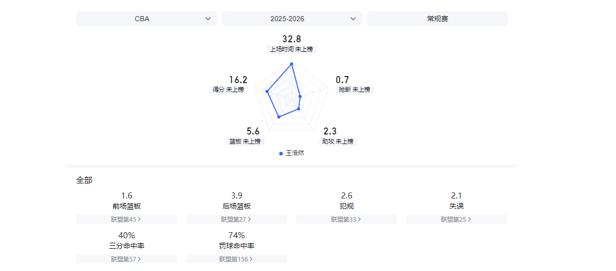 首先,让王浩然顶替曾凡博。两人均是空间型四号位打法,且对比之下王浩然本赛季状态更好,小技术更全面,球商更高。18次出场后,王浩然场均16.2分5.6篮板2.3助攻,三分命中率可保持在41.5%。曾凡博场均数据暂时只有9.6分2.5篮板,三分命中率仅为30.8%。